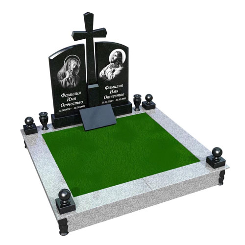 Гранитный памятник для двоих с крестом. Цоколь облицован серой плиткой из покостовского гранита, шары из габбро для украшения.