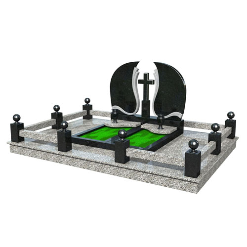 Эксклюзивный гранитный комплекс для семейной пары. Два памятника с волнами, гранитный крест посредине. Оригинальная дизайнерская ограда, облицовка серой покостовской плиткой.